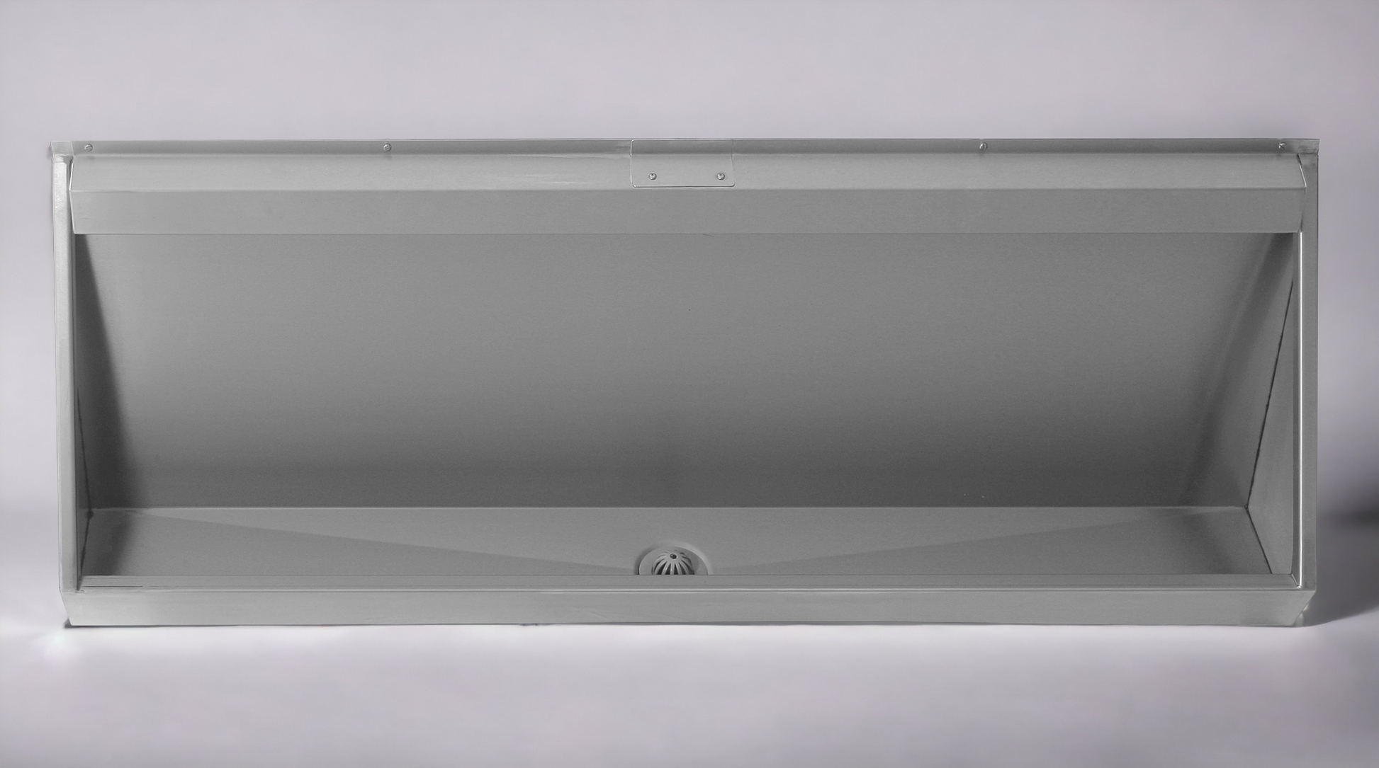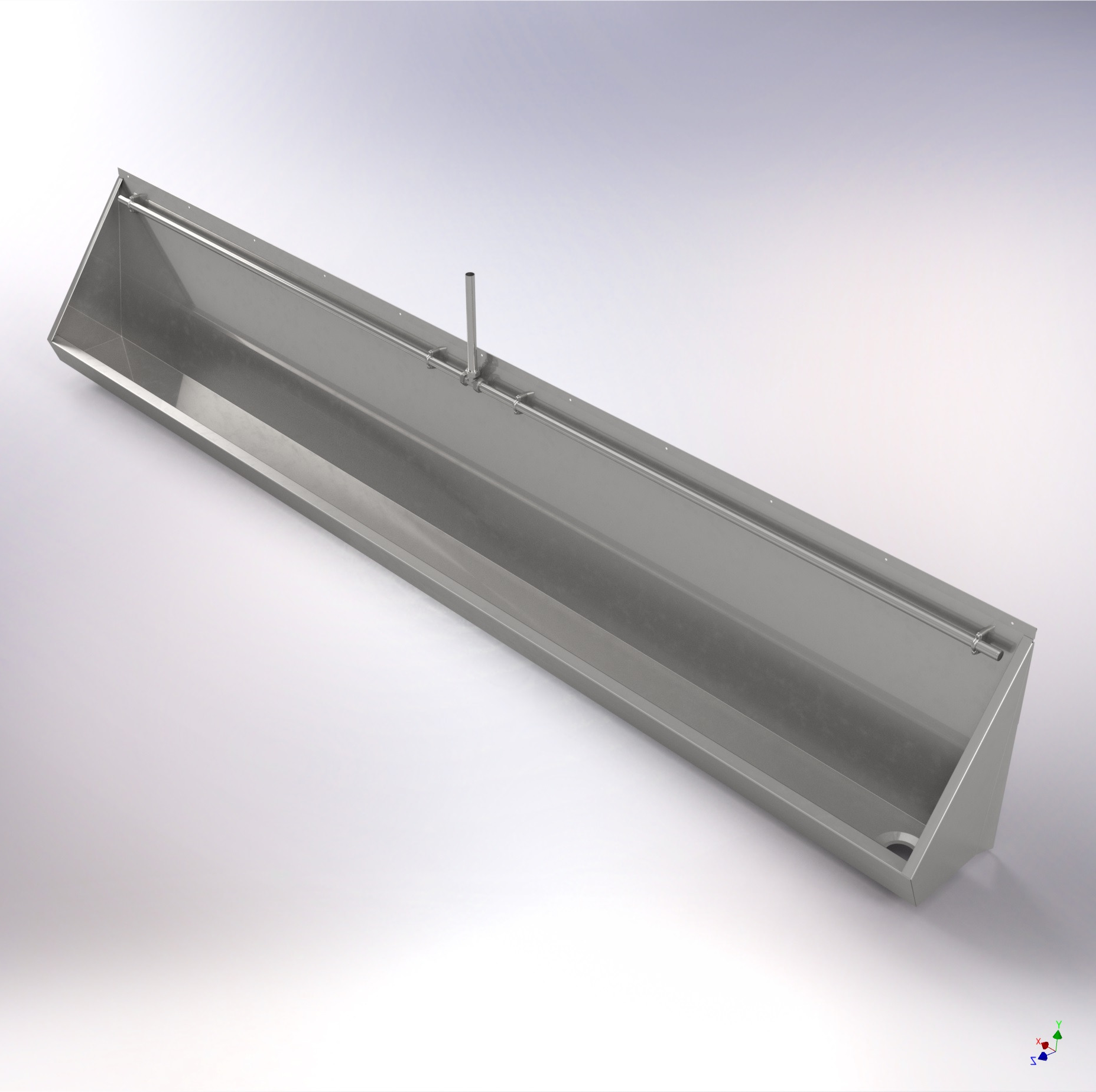Stainless steel wall mounted trough urinal with polished ends, 50mm BSP outlet with grated waste fitting at Left, Right or Centre Position, complete with an Exposed or Concealed plastic auto cistern, stainless steel downpipe and Exposed or Concealed sparge pipes.