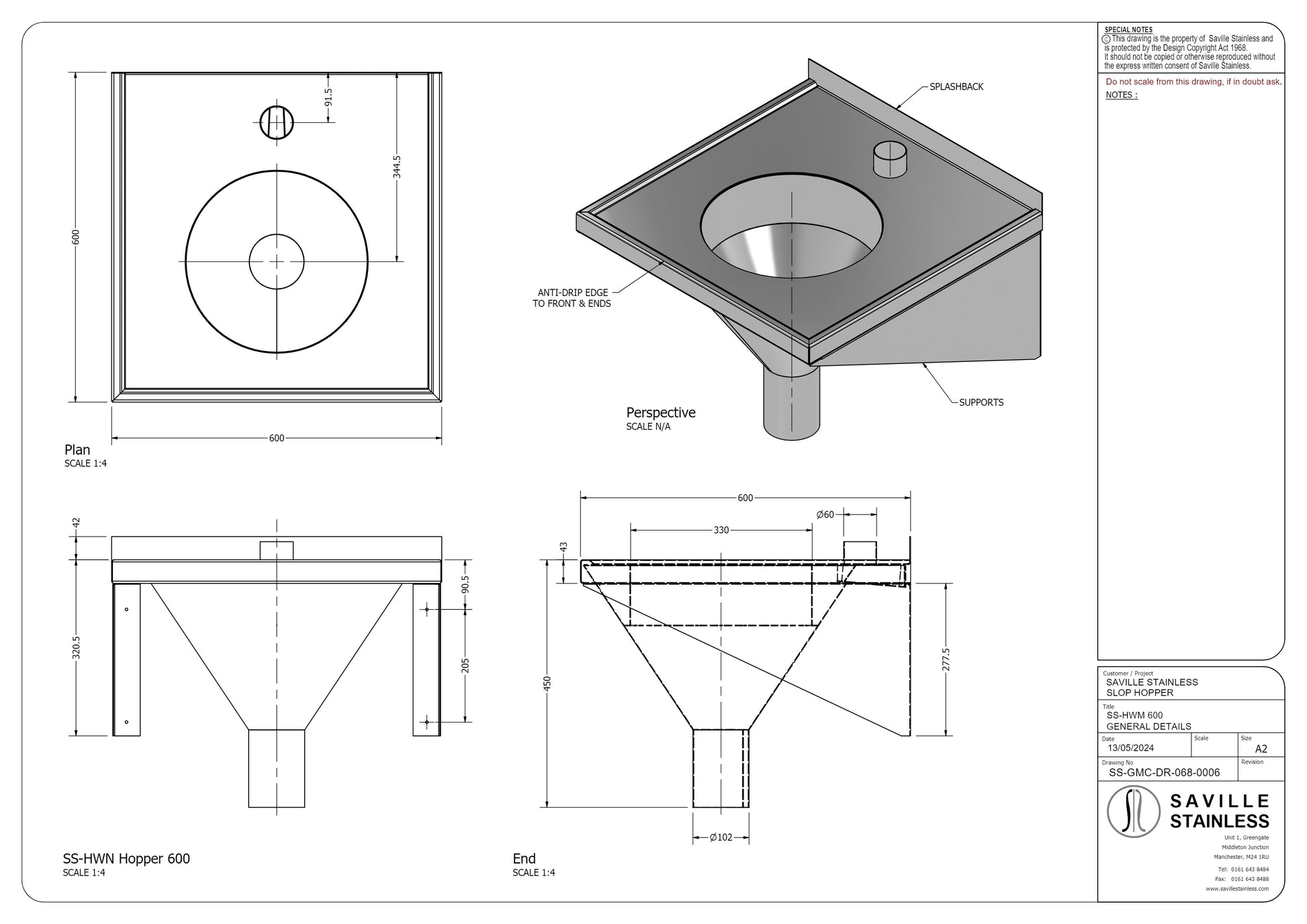 SS/HWM 600 x 600mm stainless steel wall mounted disposal hopper with a TOP inlet flushing rim, 100mm O/D stainless steel straight spigot with a plastic ‘P’ or “S” trap outlet, upstand to rear, anti drip edge to front and both sides and complete with stainless steel wall brackets and front support legs – Cistern, Flush Pipe and Grating Not included